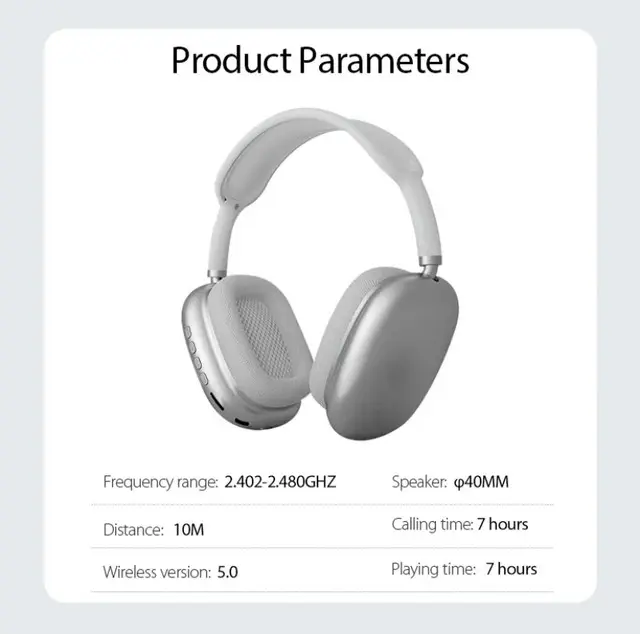 Bluetooth version:5.3Transmission distance: 10Battery capacity: 400mAhFrequency response:20Hz~20KHzSensitivity: 105÷3dbSpeaker diameter: 40mmCall playback time: about 7-10 hoursStandby time: about 120hCharging time: about 2hBuilt-in microphone: YESUsage mode:Bluetooth/TF card mp3 mode (MaximumSupport 32g)Charging voltage:5V-1ASong switching: SupportVolume adjustment: SupportAnswer the call/hang up the call: SupportAudio I/O interface:SupportPackage:1 x P9 Bluetooth Headphone1 x Charge cable1 x ManualnStoreExcellentWarranty: 7 DaysReturn Policy: Damage products Cannot be exchange